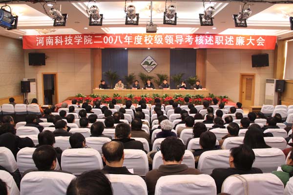 1月7日下午,我校在图书馆二楼报告厅召开了2008年度校级领导干部述职述廉大会。以河南省委高校工委专职委员金法同志为考察组组长的一行5人出席会议。会议由校党委副书记、校长王清连主持。