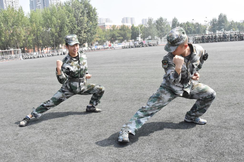 瞧,新同学们身着整齐的军装,从站军姿、稍息、立正、跨立等基本项目开始学起。每一个动作,教官都亲自分解示范与指导,从摆臂到踢腿,从握拳到绷脚,都要通过教官严格把关,长时间的站立让新生们感觉有些不适,但同学们仍然咬紧牙关坚持着,充分展现了我校学生自强不息的坚韧品质。
