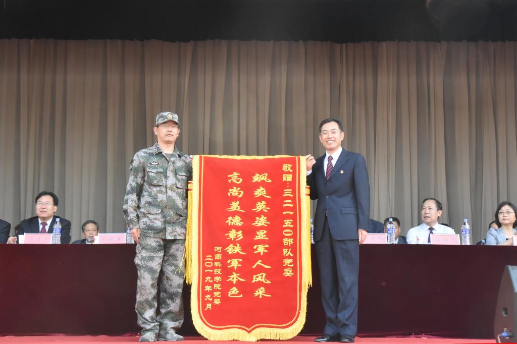 在热烈的掌声中,校长李成伟向帮训部队赠送锦旗。
