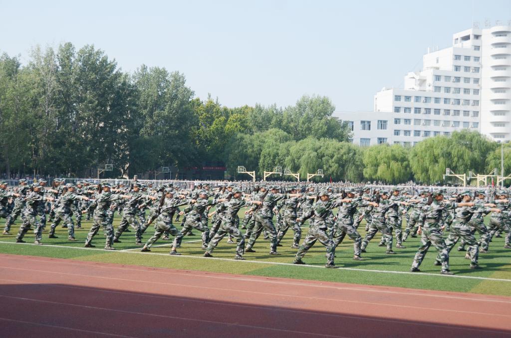 在军训项目表演中,男子军体拳表演出拳刚劲有力、踢腿凌厉迅猛、杀声震天、豪情满怀,尽显男儿铁血本色;80余名女子新生带来了精彩的匕首操,她们一突一刺、一防一击,展现了铿锵玫瑰的魄力和我校女生“巾帼不让须眉”的风采;实战训练环节模拟了真实战场,冲锋战士手持步枪、匍匐前进,动作干净利落、制敌机智勇敢;手语操表演《我们都是追梦人》表达了青年学子在习近平新时代中国特色社会主义思想的指引下,努力奋斗、报效祖国的决心和信心;他们通过不断变换队形以“1939”“80”等字形向学校80华诞献礼。