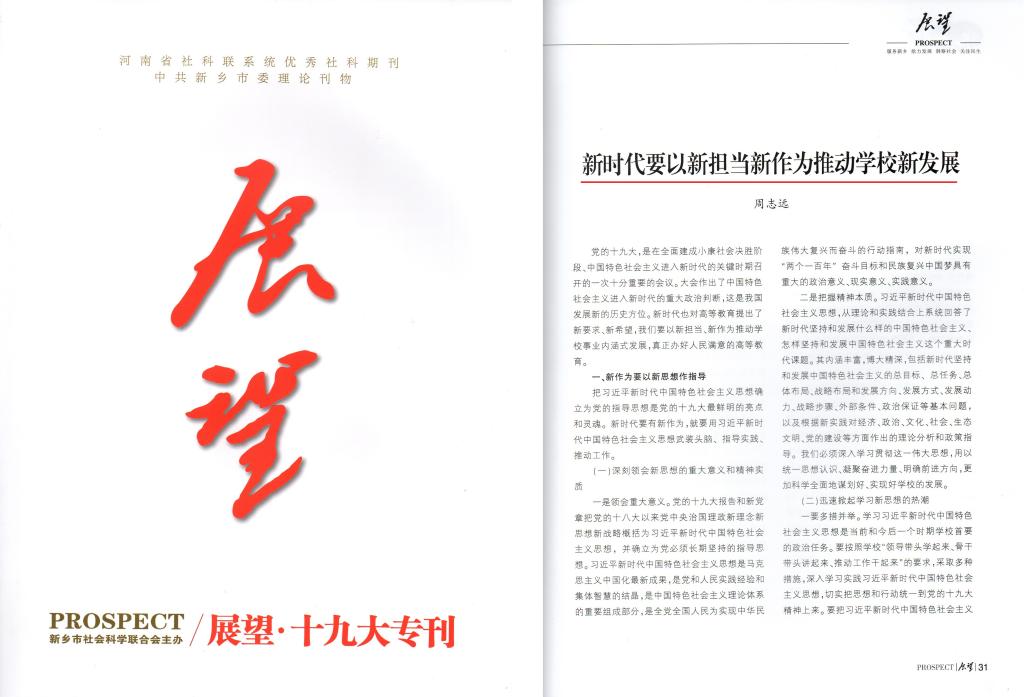 近日,校党委书记周志远学习贯彻十九大精神的署名文章《新时代要以新担当新作为推动学校新发展》在中共新乡市委理论刊物《展望》上刊发。文章从新作为要以新思想做指导、新作为要有学校方位新判断、新作为要有推进改革的新举措、新作为要有全面从严治党新气象等四个方面,深入阐述了我校贯彻落实十九大精神、以新担当新作为推动学校事业内涵式发展、办好人民满意的高等教育等方面的思考和实践。文章全文如下: