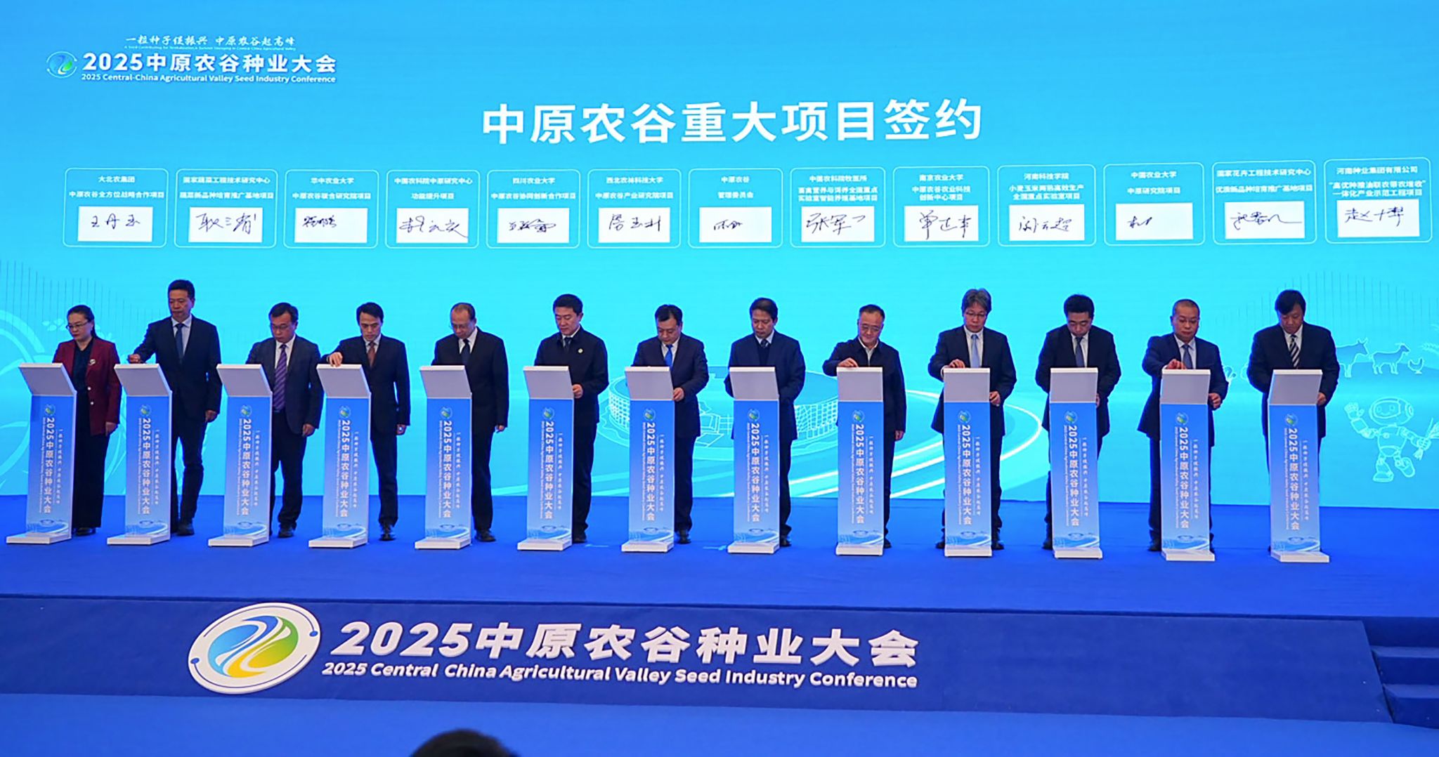 11月6日,2025中原农谷种业大会在郑州召开。来自国内外农业领域顶尖专家学者、龙头企业代表等400余人齐聚一堂,共商种业创新发展大计,共绘现代种业发展蓝图。省委书记刘宁、中国农业科学院党组书记杨振海、国际植物新品种保护联盟理事会原主席崔野韩出席开幕式并致辞。我校校长阚云超应邀出席开幕式,并代表学校国家重点实验室签约中原农谷重大项目,为我校深度参与中原农谷建设、助力种业科技创新再添新动能。