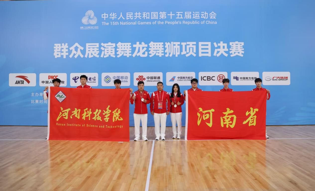 11月11日下午,中华人民共和国第十五届全国运动会舞龙舞狮项目决赛在广东佛山激烈展开。本次赛事共有80支运动队、892名参赛人员。由河南科技学院牵头组建、以我校师生为主体的舞狮队代表河南省出征,为河南省代表团勇夺该项目第一块宝贵银牌,实现了“为学校扬名、为新乡添彩、为河南贡献”的赛前目标。