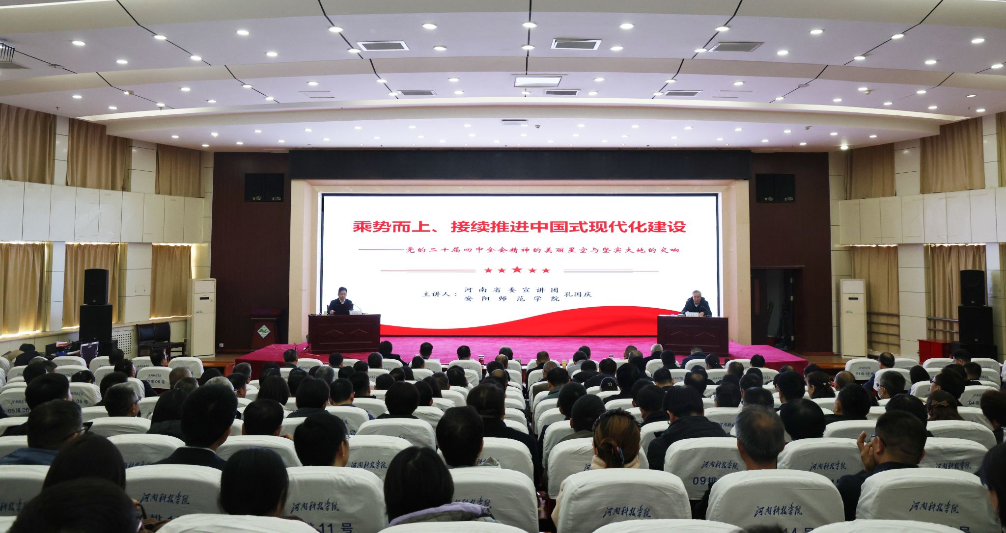根据省委统一安排,12月1日下午,学习贯彻党的二十届四中全会精神省委宣讲团在我校举行宣讲报告会,省委宣讲团成员、安阳师范学院党委书记孔国庆作宣讲报告。校党委书记宋亚伟主持报告会。全体在校校领导、学校中层干部、党校教师等260余人现场参加报告会。