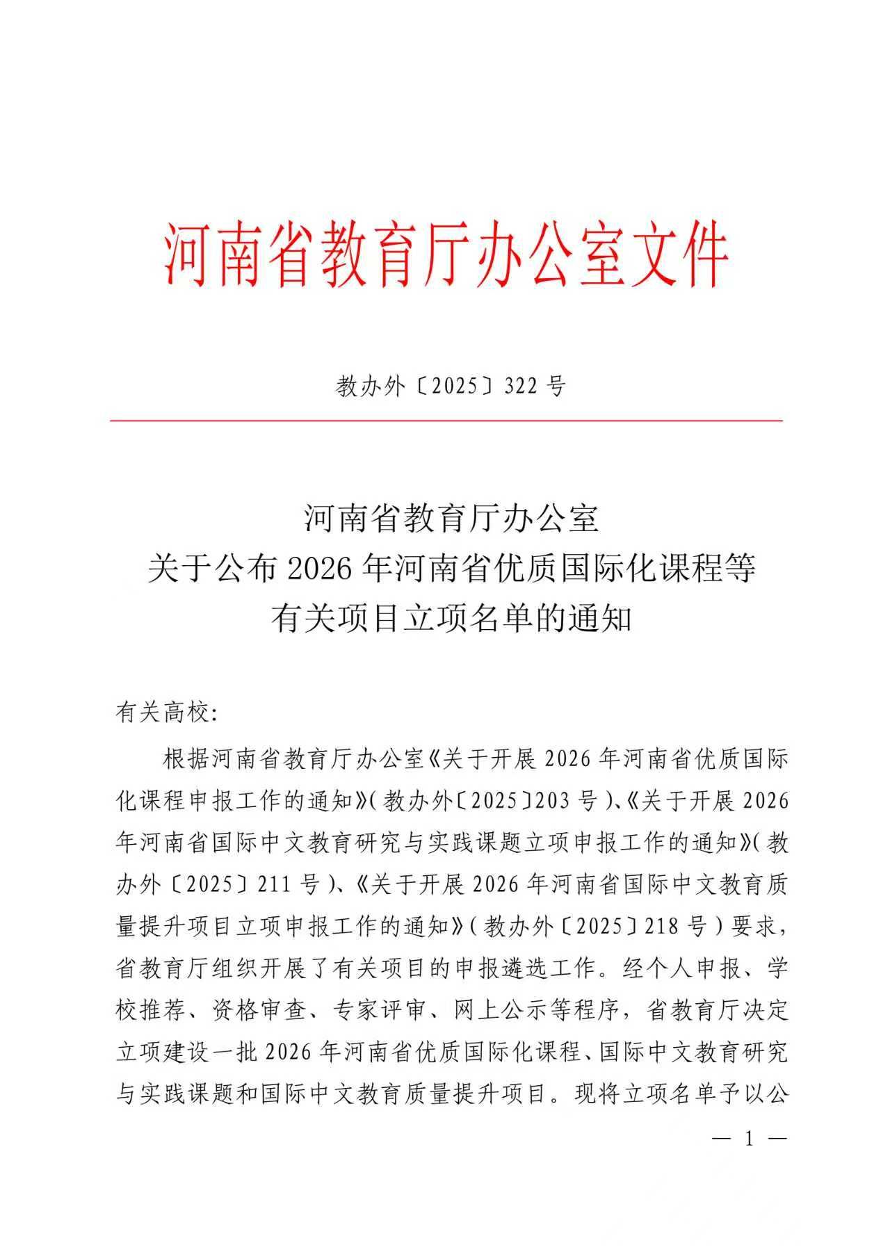 近日,河南省教育厅正式公布2026年河南省优质国际化课程及相关项目立项名单,我校宋培杰等五位老师主持的项目分别获得资助与立项支持。