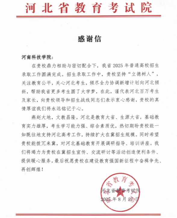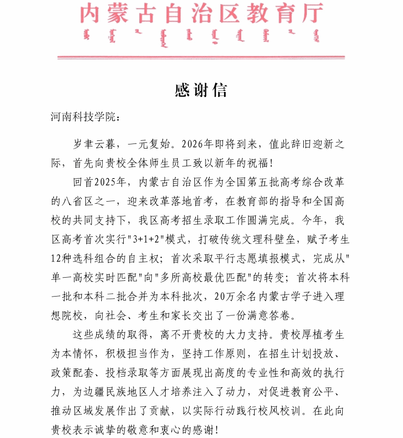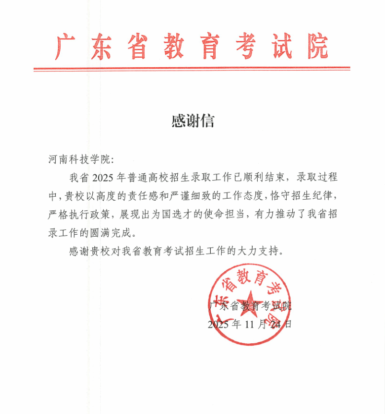 近日,我校相继收到内蒙古自治区教育厅、河北省教育考试院、广东省教育考试院的感谢信,信中对学校2025年招生工作的专业素养、责任担当和大力支持给予高度评价,对学校为各地高考招生录取工作圆满完成、促进教育公平所作出的积极贡献表示诚挚感谢。