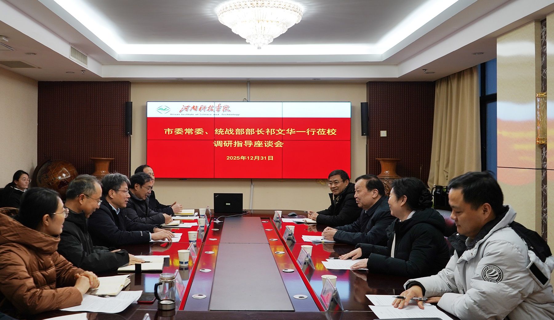 12月31日,新乡市委常委、统战部部长祁文华,新乡市委统战部常务副部长王永利等一行来校调研指导。学校在办公楼1111会议室举行座谈会,校长阚云超、校党委副书记刘全永出席,校党委宣传部、党委统战部、马克思主义学院负责人,学生代表参加座谈会。