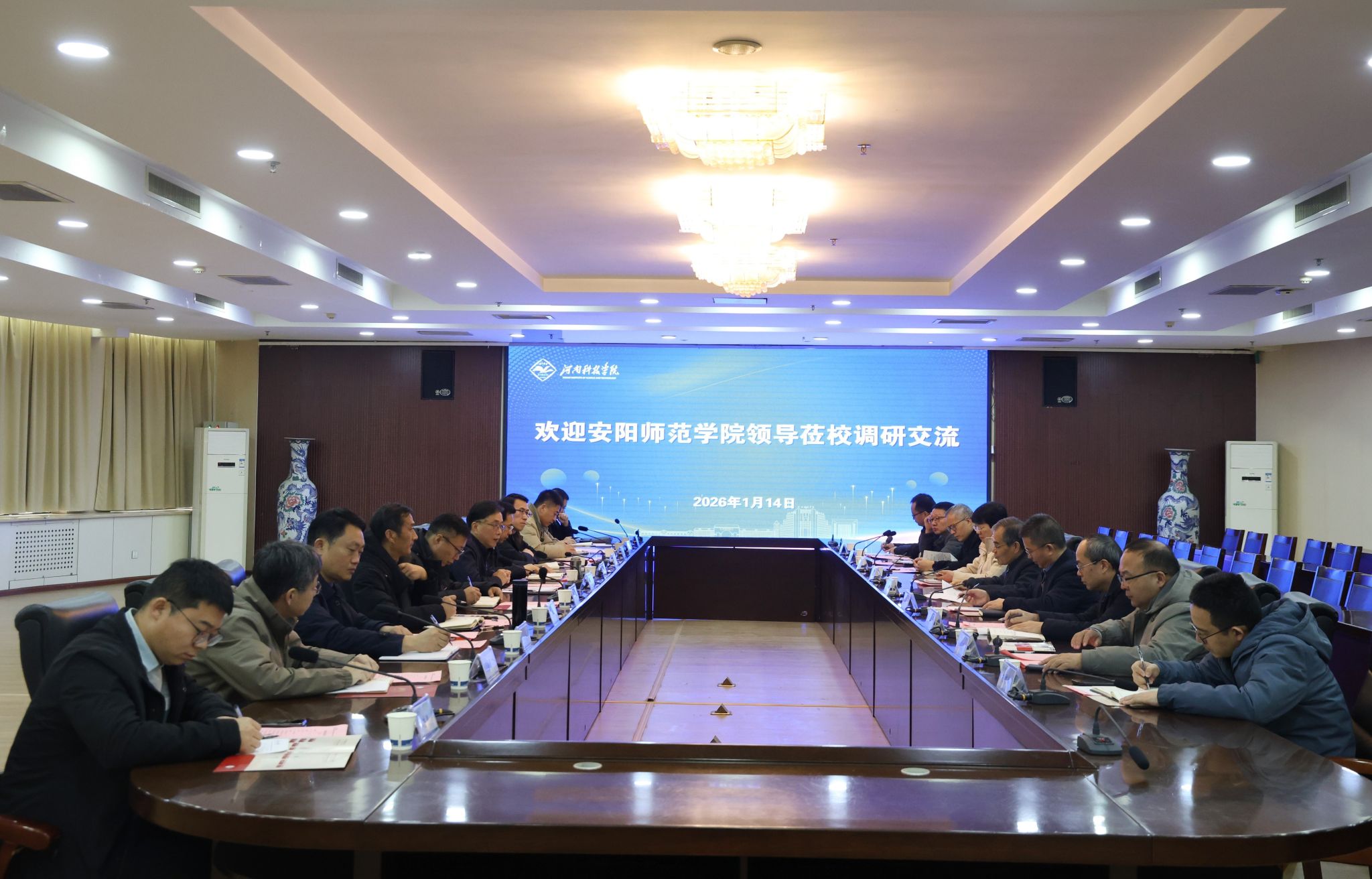 1月14日下午,安阳师范学院党委副书记牛晓玉、副校长杨新宇一行莅临河南科技学院调研交流,座谈会在办公楼206会议室举行,校党委副书记王庆兵、副校长胡铁柱出席会议,发展规划处、人事处、教务处、科技处、研究生处、基建处、招生办公室等职能部门负责人参加会议。
