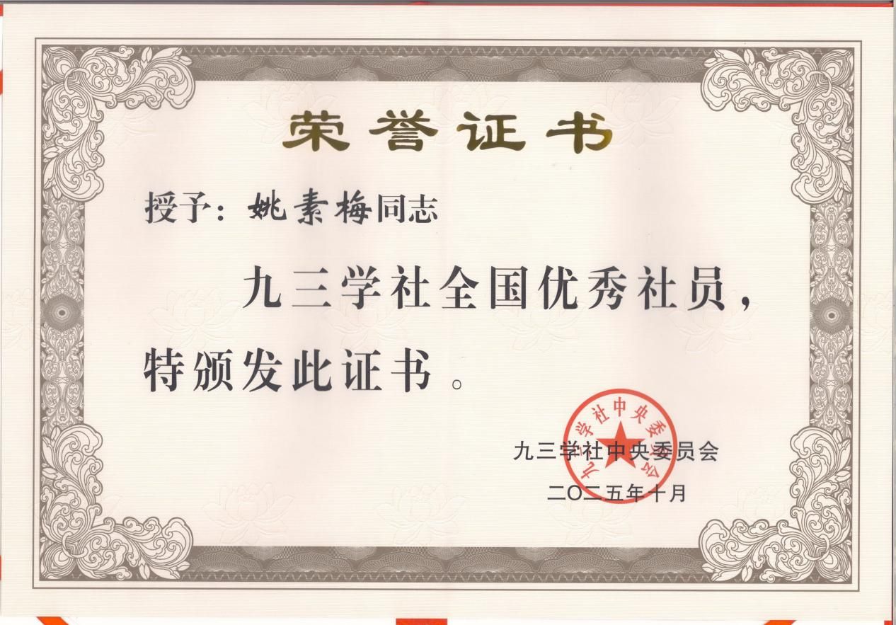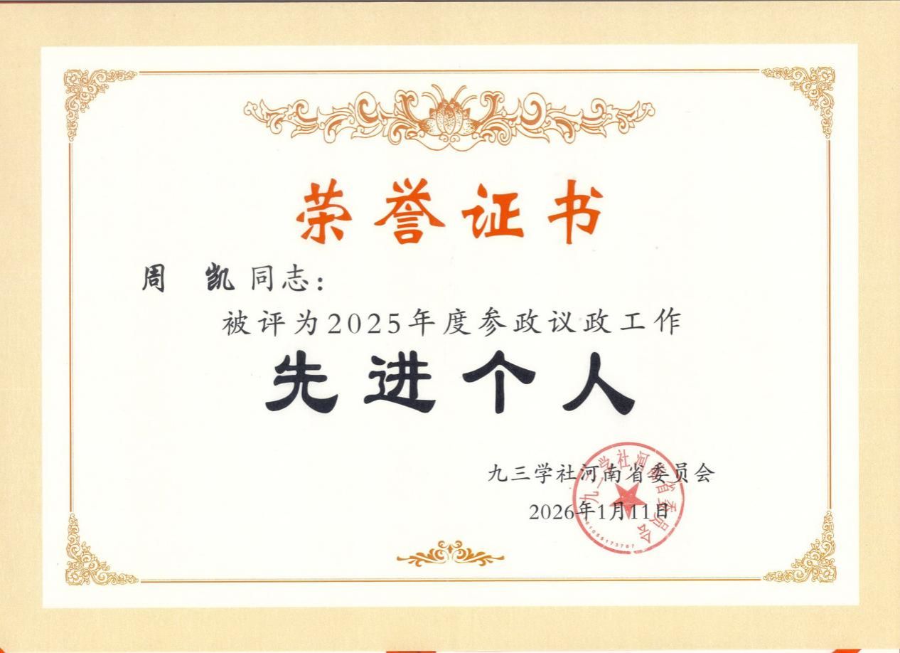 会议表彰了九三学社新乡市委会2025年度社务工作中涌现出的先进集体和个人。我校九三学社委员会被授予“组织工作先进集体”“思想宣传工作先进集体”和“社会服务工作先进集体”荣誉称号,姚素梅、周凯被评为“参政议政工作先进个人”,徐泮被评为“思想宣传工作先进个人”,张安邦、郭建彪、宋普文、王平喜被评为“社会服务工作先进个人”,韩其晟被评为“社情民意信息工作先进个人”。