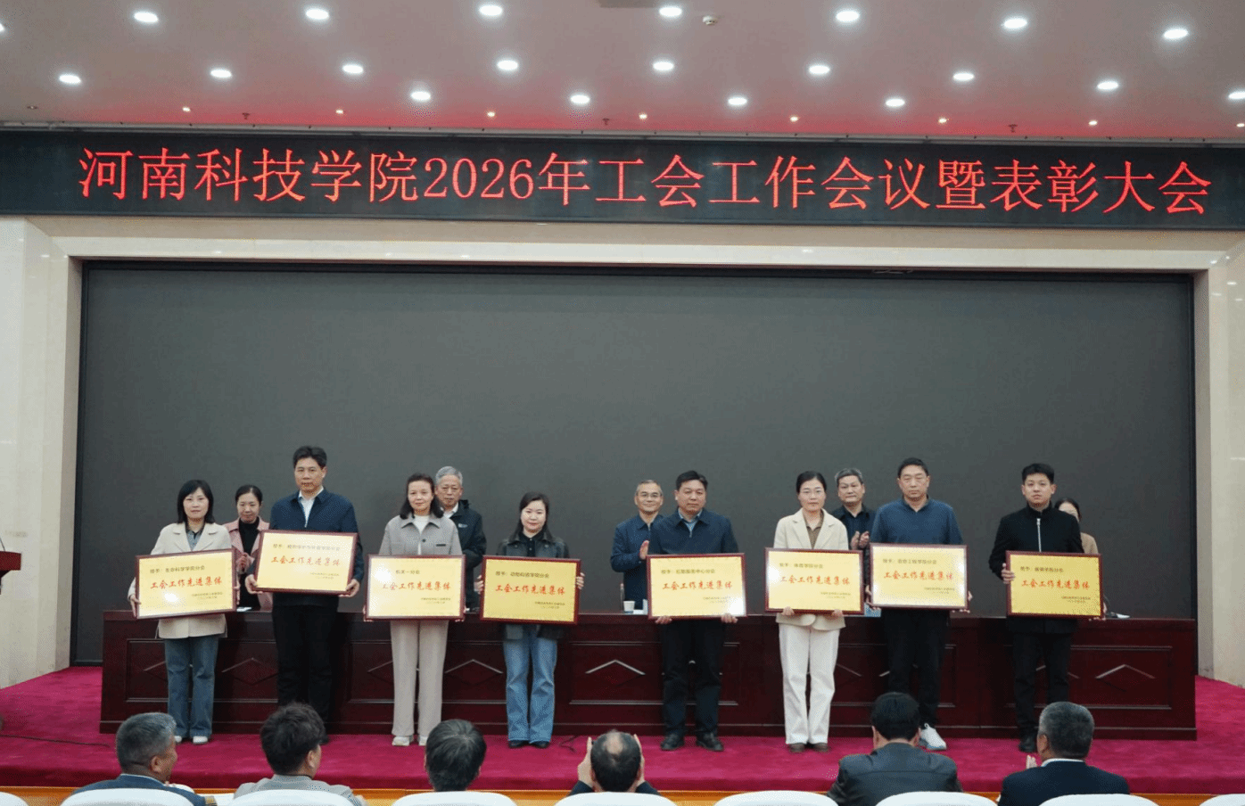 会议宣读了《关于表彰2025年度工会工作先进集体和个人的决定》《河南科技学院工会委员会2026年工作要点》,获奖单位及个人代表上台领奖。先进集体代表、先进个人代表分别作了发言。