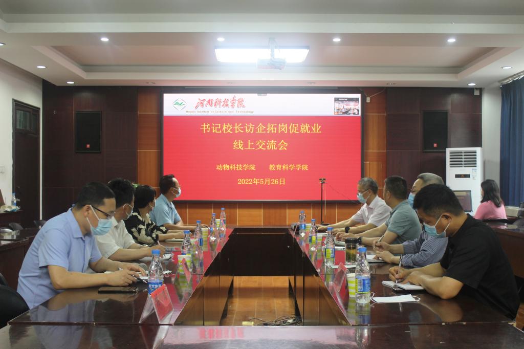 为深入贯彻落实就业工作“一把手”工程,积极响应和推进“高校书记校长访企拓岗促就业专项行动”,切实做好毕业生就业工作,5月26日上午,书记校长访企拓岗促就业线上交流会在E302会议室举办。副校长陈合义出席会议。中粮佳康有限公司、山东和康源集团、南京诺唯赞生物科技股份有限公司、方城鸿旺牧业有限公司等四家企业代表,招生就业处、动物科技学院及教育科学学院相关负责人参加会议。
