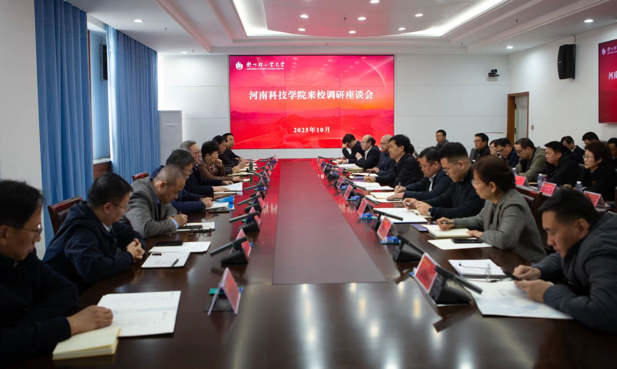 10月21日下午,副校长马金友率网络安全与信息化工作领导小组成员单位相关负责人一行21人,赴郑州轻工业大学开展信息化建设专题调研。郑州轻工业大学副校长张成、信息化建设相关单位负责人参加座谈。双方围绕信息化“十五五”规划思考、信息化建设与管理创新等方面进行交流。