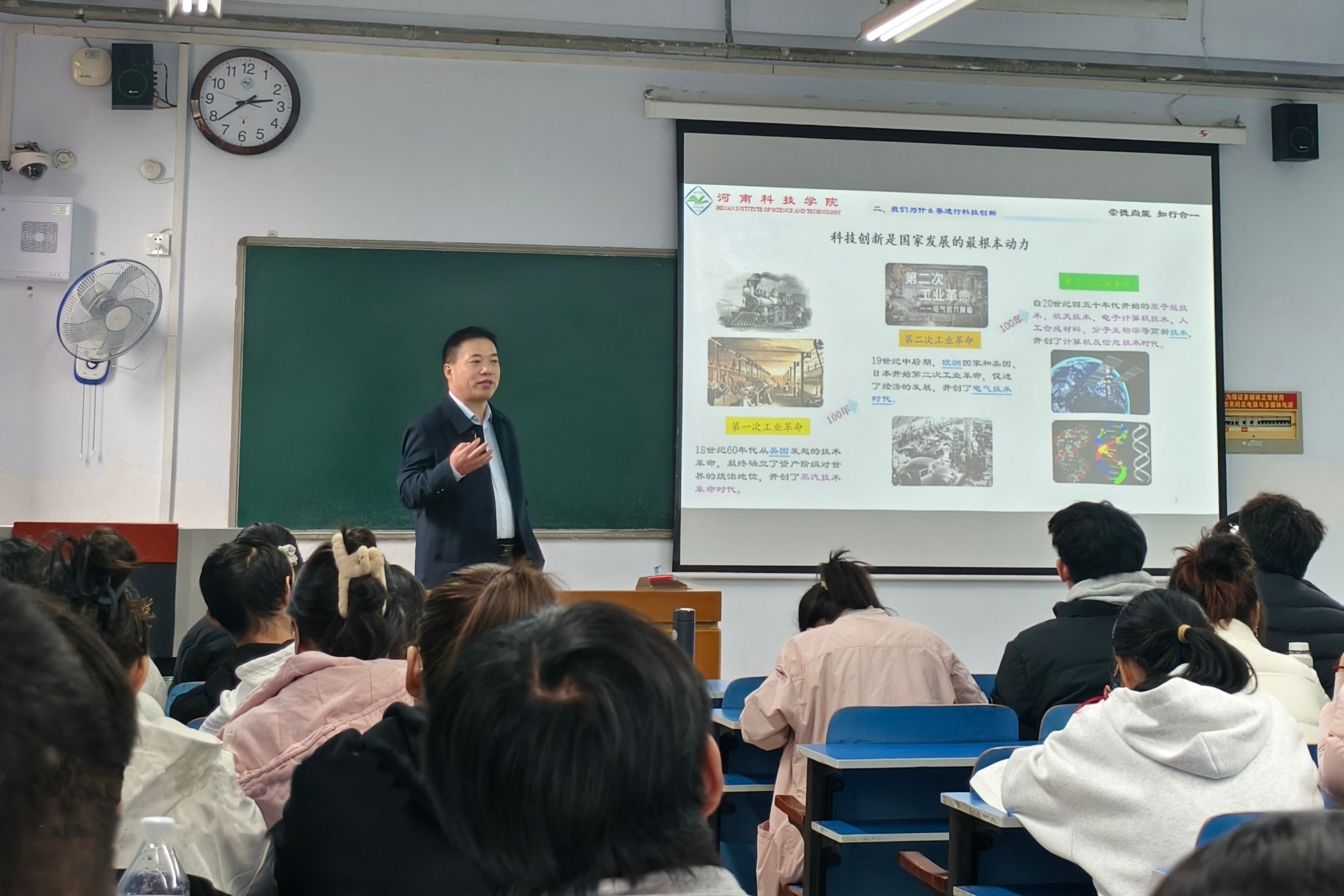 10月29日下午,副校长丁轲在3号教学楼102教室以“坚持科技自立自强,创新驱动国家快速发展”为题,为动物科技学院动药、动检专业60余名学生讲授专题思政课。