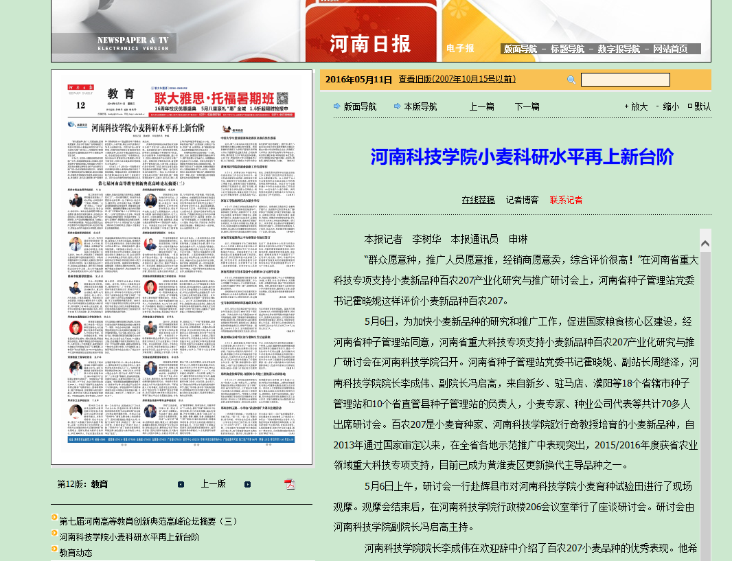 《河南日报》5月11日第12版:河南科技学院小麦科研水平再上新台阶