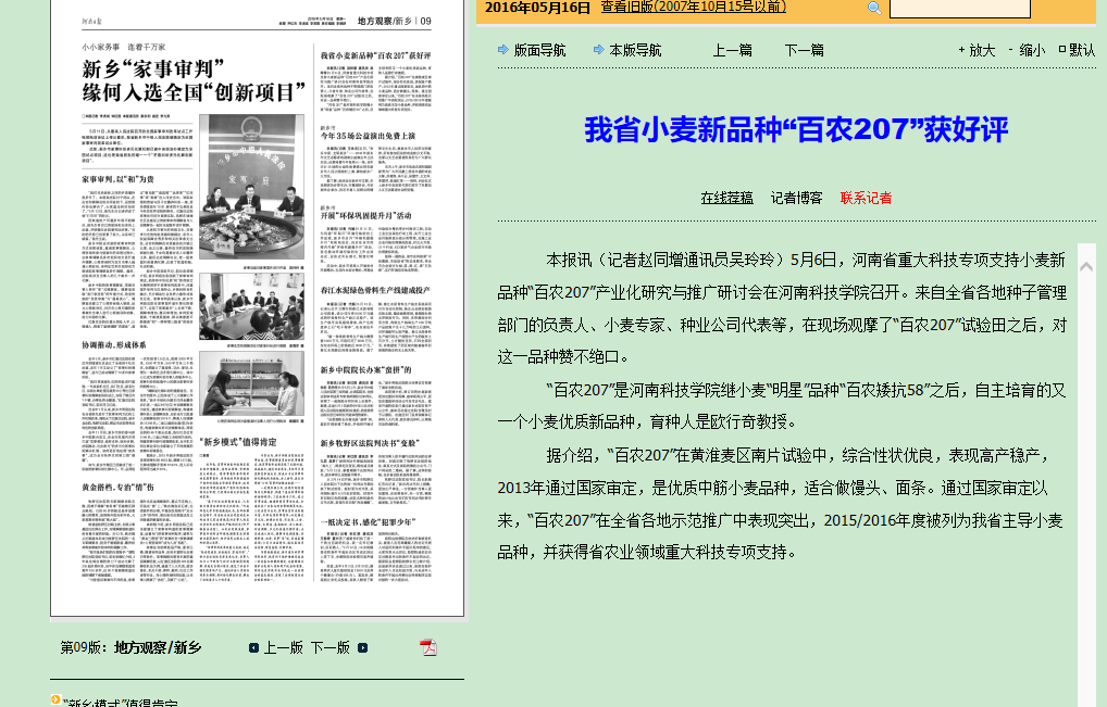 【新乡日报】5月11日第8版:省重大科技专项支持小麦新品种“百农207”产业化观摩推广会在我市召开