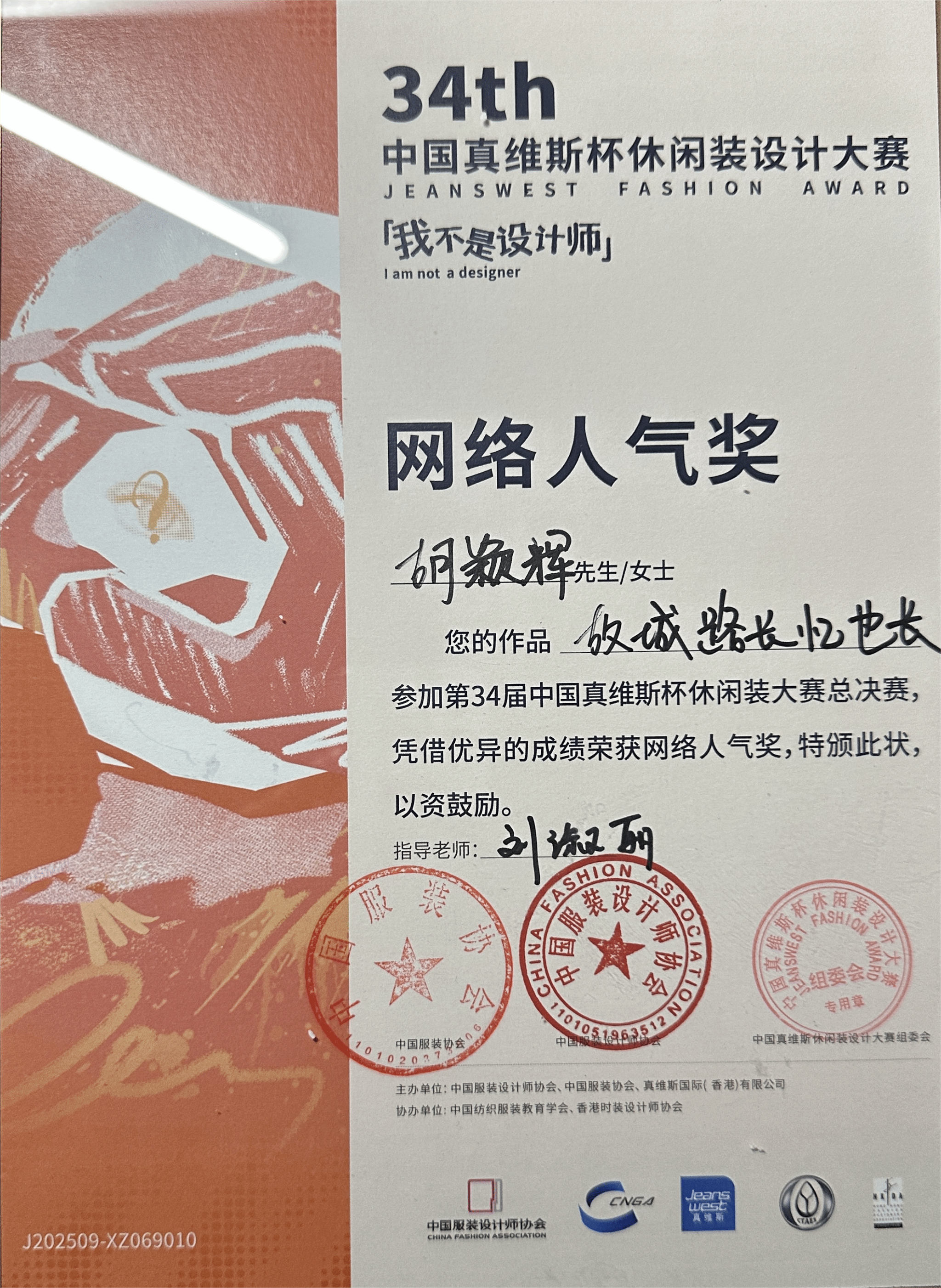 近日,第34届中国真维斯杯休闲装设计大赛总决赛在北京中国国际时装周(秋季)期间举办。在我院刘淑丽老师的指导下,23级研究生胡颖辉凭借作品《故城路长忆也长》荣获“网络人气奖”。
