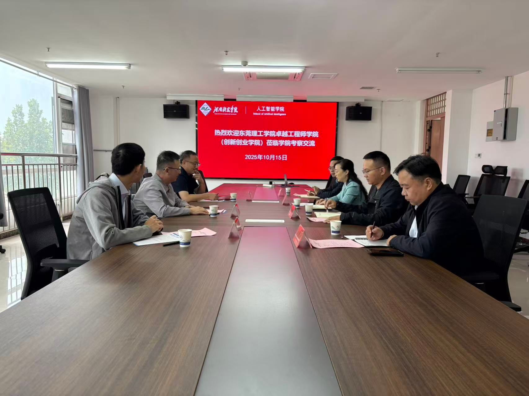 叶晖对邢大立一行来院考察交流表示热烈欢迎,简要介绍了学院发展历程和基本情况,重点介绍了学院近年来党建与产学研创深度融合的经验和做法。蔡磊详细介绍了学院近年来围绕国家重大需求,开展科技创新、成果转化、科研平台建设与应用型人才培养等方面的工作体会。邢大立对我院的热情接待表示感谢,期待未来能够与我院在更多领域展开深度合作。胡文龙介绍了东莞理工学院的办学历史以及卓越工程师学院(创新创业学院)的基本情况,对学院在人工智能相关领域取得的成绩表示高度赞赏。