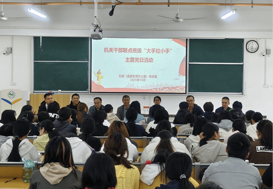 为落实机关干部联系班级工作相关要求,10月16日上午,校纪委监察专员办公室党支部同文法学院中文251、252和法学251、252四个联点班级开展“小手拉大手”主题党日活动。活动由校纪委第二纪检监察室主任李军庆主持。