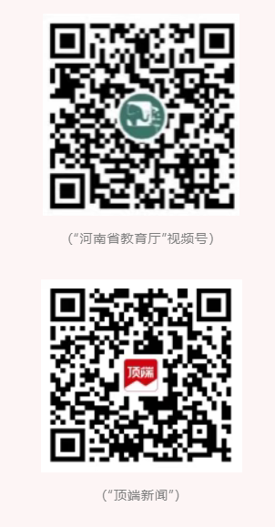 扫码关注“河南省教育厅”视频号,点击屏幕上“预约”,待直播开始即可观看。或扫码关注“顶端新闻”,直接观看直播。