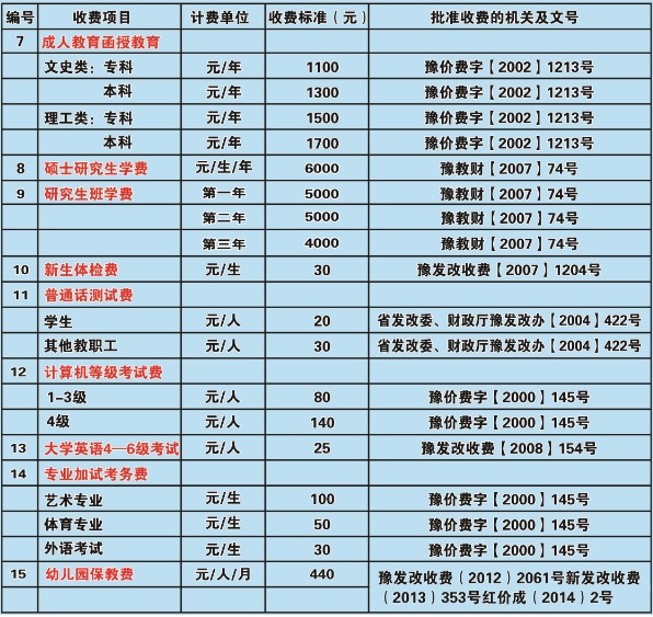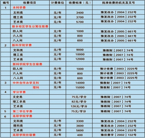 为了更好贯彻执行教育部、国家发展和改革委员会、财政部关于高等学校教育收费公示制度的规定,按照河南省教育厅、河南省发展和改革委员会、河南省财政厅豫教财[2007]74号文《河南省教育厅、河南省发展和改革委员会、河南省财政厅关于进一步规范普通高校收费管理的通知》的要求,为规范高等学校收费行为,增强收费透明度,接受社会各界人士监督,现将我校各类学生收费标准公示如下: