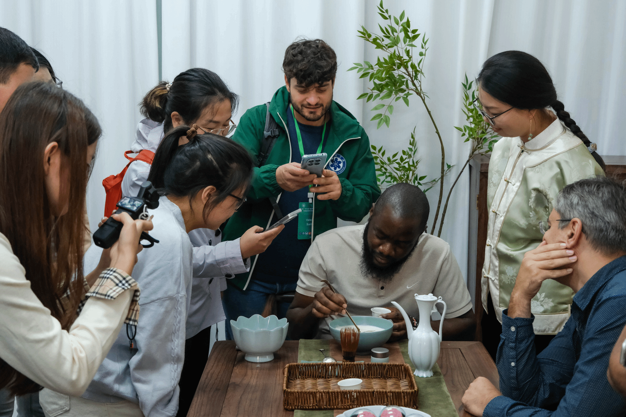 张义萌以一场秋至茶会为主题,带领外籍专家学者步入宋代点茶的美学世界。碾茶、罗茶、候汤、熁盏、调膏、击拂,一系列动作优雅娴熟,随着茶筅的快速搅动,茶汤表面渐渐泛起丰富细腻的泡沫,宛如积雪。外籍专家学者纷纷执筅尝试,在点茶的一招一式中,体味古人的雅致生活与茶道哲学。