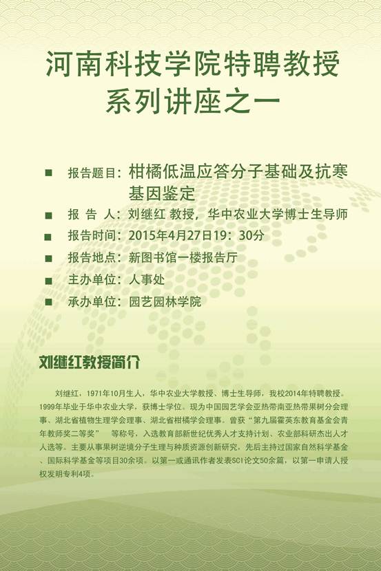 河南科技学院特聘教授系列讲座之一:柑橘低温应答分子基础及抗寒基因鉴定