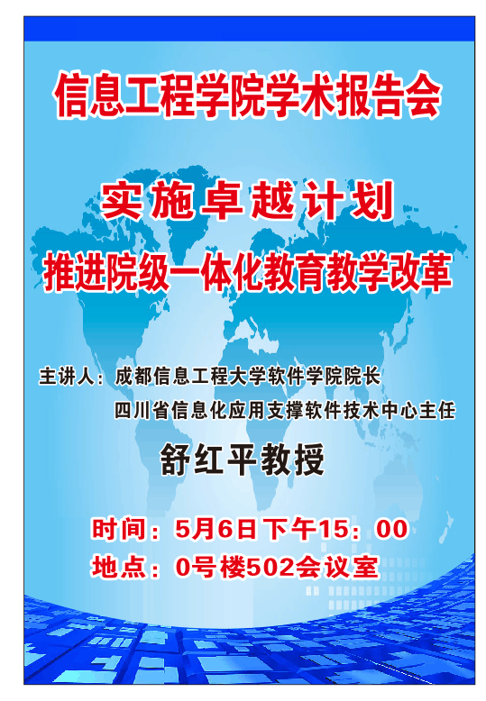 舒红平,博士、教授、硕士生导师,学校学术科研骨干及计算机应用技术省级重点学科数据库及知识工程研究方向带头人。毕业于四川大学,获计算机应用技术专业博士学位。现任成都信息工程学院软件工程学院院长,兼任飓风软件研究所所长。在数据库技术、计算机在制造业中的应用、数据融合及数据挖掘方向深有研究。完成国家自然科学基金1项,主持四川省科技厅项目2项,四川省教育厅教改项目2项。发表数据库、数据融合与数据挖掘方面的论文四十余篇,其中EI收录12篇,ISTP收录6篇。主持开发的“基于JavaEE的可配置信息化应用平台”获四川省科技进步三等奖、成都市科技进步三等奖。