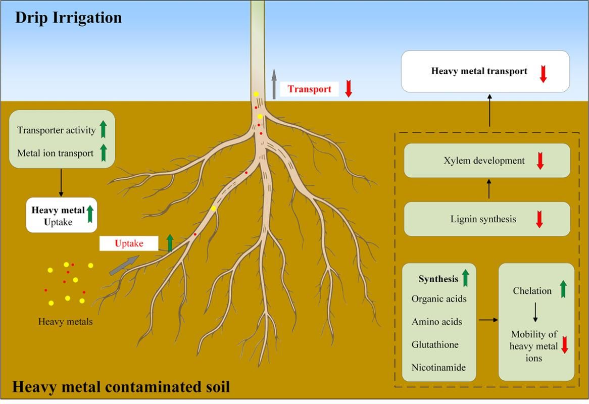 该研究针对农田土壤镉、铅、铬(VI)复合污染问题,系统揭示了滴灌通过强化根系固持、抑制木质部发育,从而降低大豆重金属向地上部与籽粒转运的生理与分子机制,为重金属污染农田的安全利用提供了重要理论依据。研究发现,滴灌可显著提升大豆根系抗氧化与渗透调节能力,促进根系健壮生长;通过上调金属离子转运相关基因增强根系重金属吸收,并激活有机酸、谷胱甘肽、烟酰胺等小分子合成通路实现重金属胞内固持;同时下调木质素合成关键基因,限制木质部导管发育,从源头阻断重金属长距离向上运输。