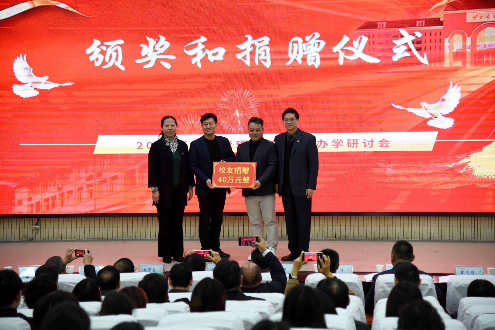 在颁奖与捐赠环节,学院为10名学子颁发了“兆海励志助学金”,并举行了捐赠扩增仪式。校友霍光耀、张光辉代表捐赠人向学院新增捐赠40万元,续写“手牵手、伴成长,学友情、圆梦想”的感人篇章。仪式上,主持人何二毛引用泰戈尔的诗句与比亚迪创始人王传福的话语,寄语师生“借光发光,照亮他人”,将现场氛围推向高潮。