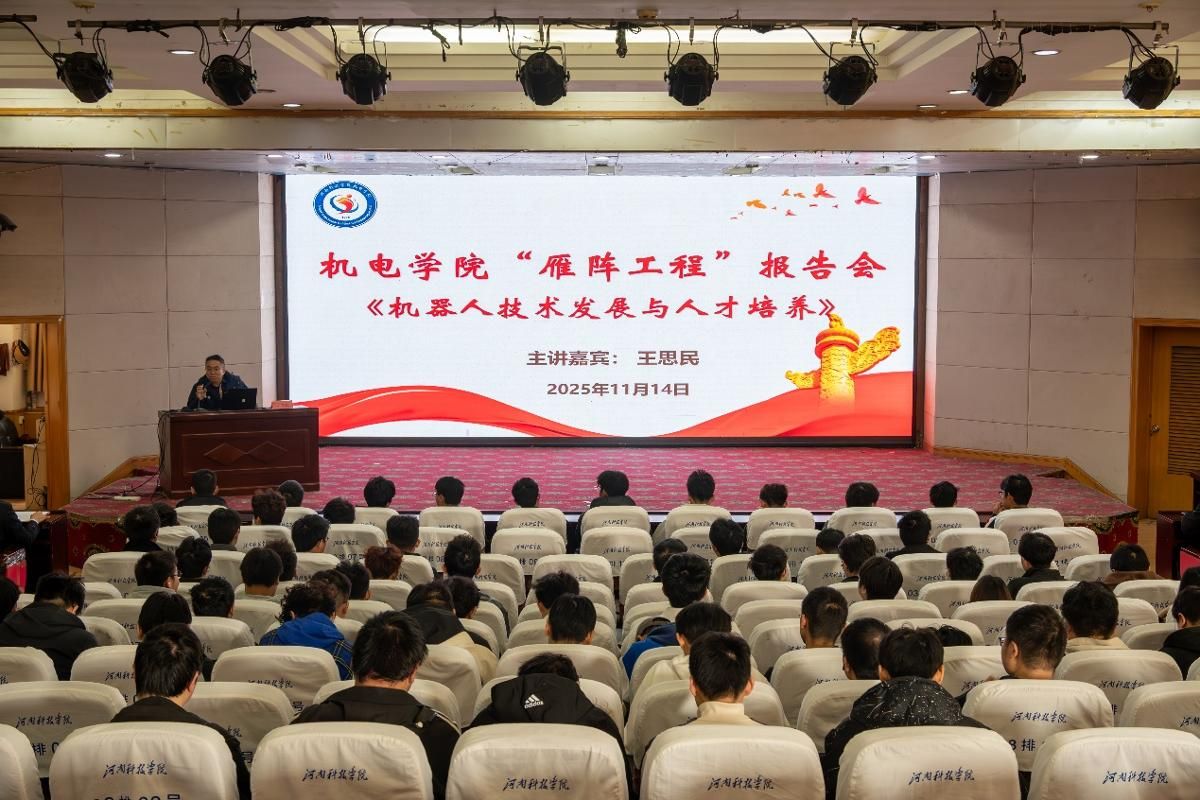 11月14日,机电学院在图书馆一楼报告厅成功举办《机器人技术发展与人才培养》专题报告会。报告会由河南威猛振动设备股份有限公司总经理王思明担任主讲,学院180余名学生到场聆听。学院党委副书记何涛主持本次报告会。