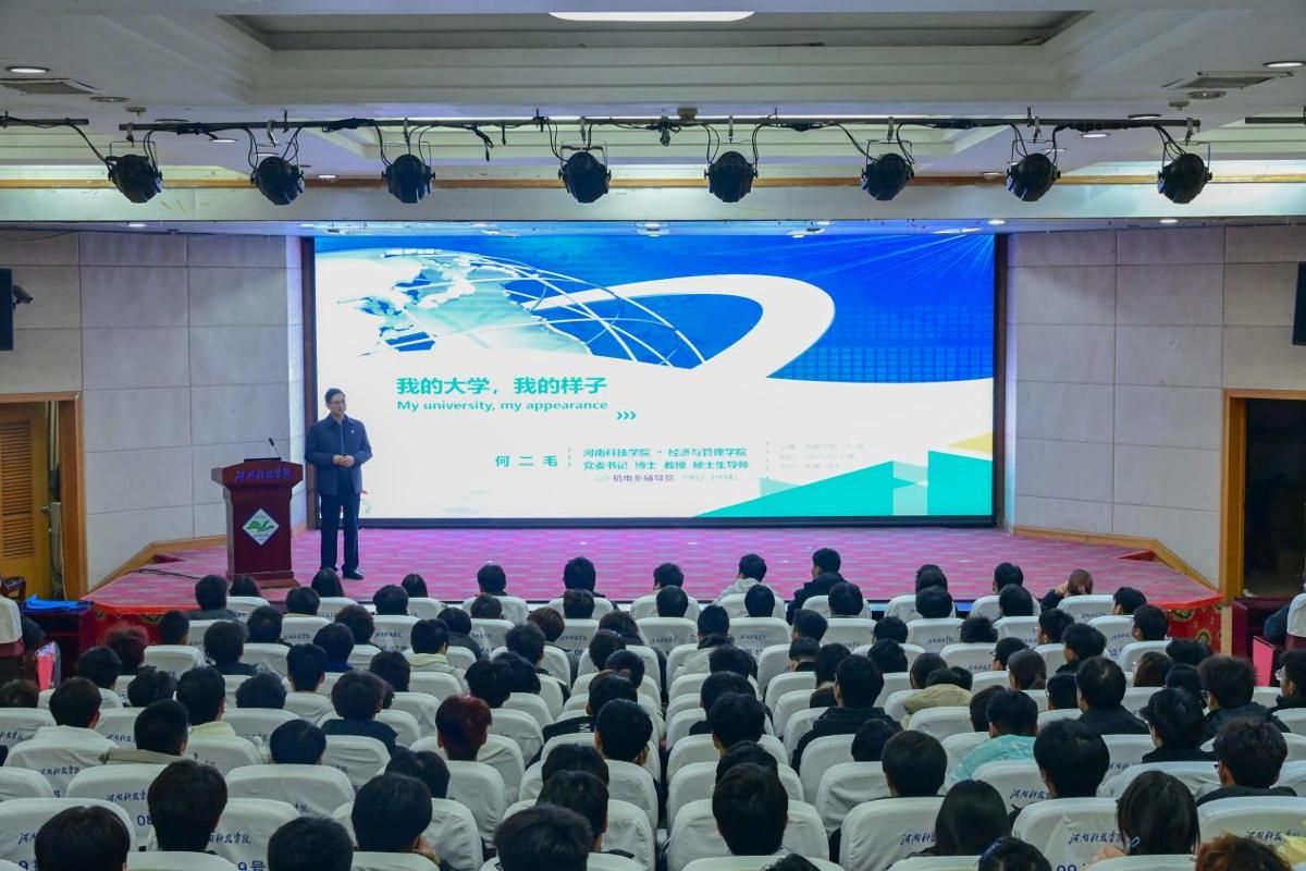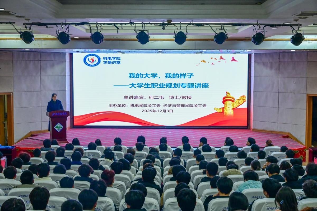 12月3日晚,机电学院在图教201报告厅举办大学生职业规划专题讲座。经济与管理学院党委书记何二毛教授应邀担任主讲嘉宾。机电学院党委书记张雅凌、年级辅导员及2025级新生共计300余人参加活动。讲座由张雅凌主持。