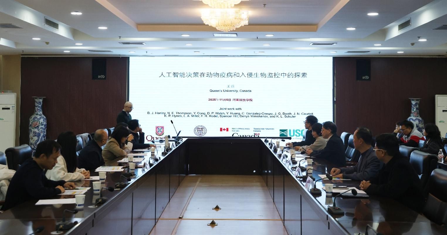 11月6日,加拿大女王大学王珏教授应邀在“野生动物健康与One Health研讨会”上,作题为《人工智能决策在动物疫病和入侵生物监控中的探索》的专题报告,为河南科技学院动物科技学院师生带来一场学术盛宴。