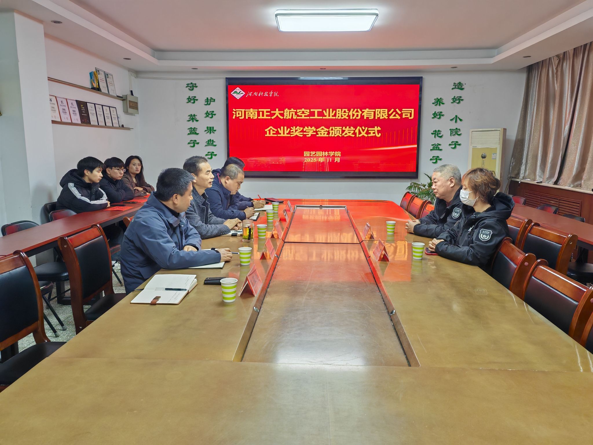 11月24日上午,河南正大航空工业股份有限公司企业奖学金颁发仪式在园艺园林学院实验楼B316会议室举行。公司总经理程军及随行工作人员到校出席,学院班子成员、党政办主任、设计院负责人及获奖学生代表参加仪式,仪式由学院副院长张毅川主持。