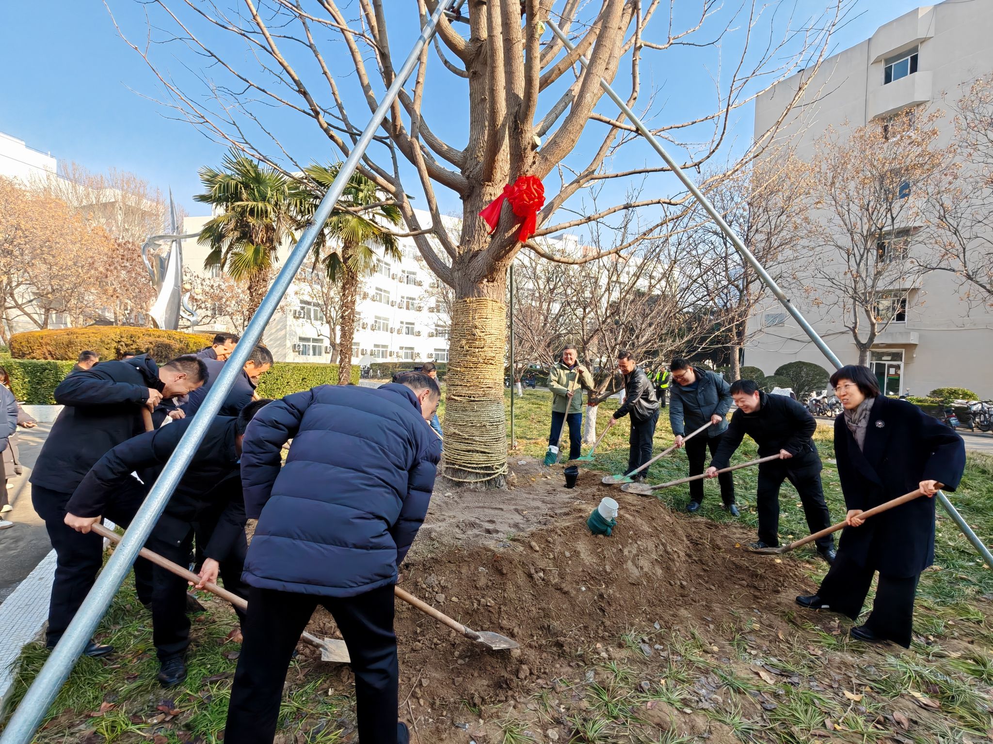 仪式最后,大家一同为两棵银杏树培土浇水。