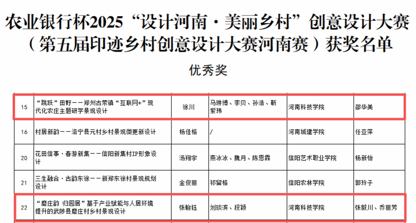 近日,由河南省农业农村厅、河南省教育厅、河南省工业和信息化厅、河南省自然资源厅、河南省住房和城乡建设厅、河南省文化和旅游厅、共青团河南省委联合举办的农业银行杯2025“设计河南·美丽乡村”创意设计大赛(第五届印迹乡村创意设计比赛河南赛)评奖结果正式揭晓。本次大赛共收到近千件参赛作品,园艺园林学院学子凭借扎实的专业基础、敏锐的创新意识和良好的实践能力,在本届赛事中表现突出,荣获佳绩,充分展现了学院在规划设计类人才培养方面的显著成效。