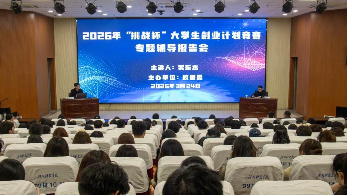 为持续深化创新创业育人工作,切实提升2026年“挑战杯”竞赛参赛作品质量,助力师生备赛提质增效,3月24日晚,我校在图书馆一楼报告厅举办专题辅导报告会。本次报告会特邀“挑战杯”赛事指导专家、郑州大学裴东杰博士主讲,各学院指导老师及参赛学生代表共260余人参会,会议由校团委负责人主持。