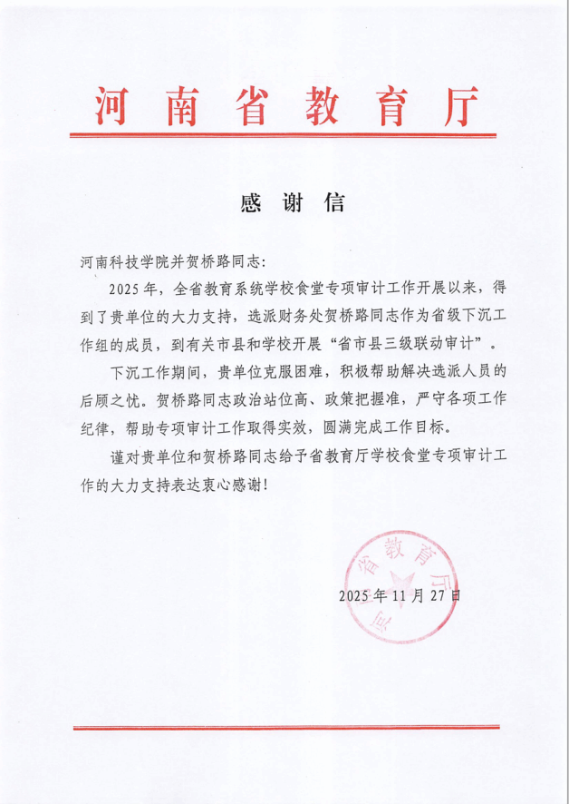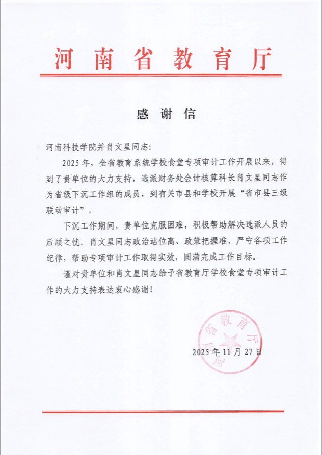 近日,河南省教育厅向我校发来两封感谢信,对学校在“2025年全省教育系统学校食堂专项审计”工作中给予的大力支持表示衷心感谢,并对财务处肖文星、贺桥路两位同志在专项审计工作中的出色表现予以高度肯定和表彰。