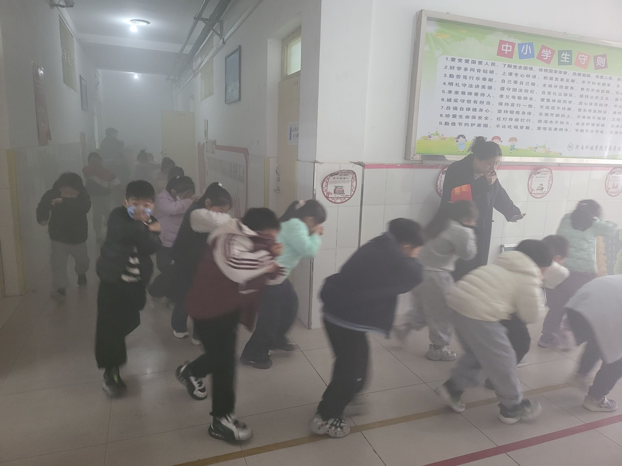 急促的消防警报响起,演练进入实战环节。教学楼楼道已提前释放烟雾,模拟真实火情的烟雾迅速弥漫,营造出紧张的实战氛围。在老师指引下,学生们立即采取“弯腰低姿、双手捂鼻”的防护姿势,避开高浓度烟雾区域,按预设分东西两路沿楼梯靠右撤离。老师全程提醒“保持间距、注意脚下”,保障撤离安全高效。从警报拉响到全体师生抵达操场安全区域,仅用时2分33秒,充分体现了应急预案的科学性与师生执行力。