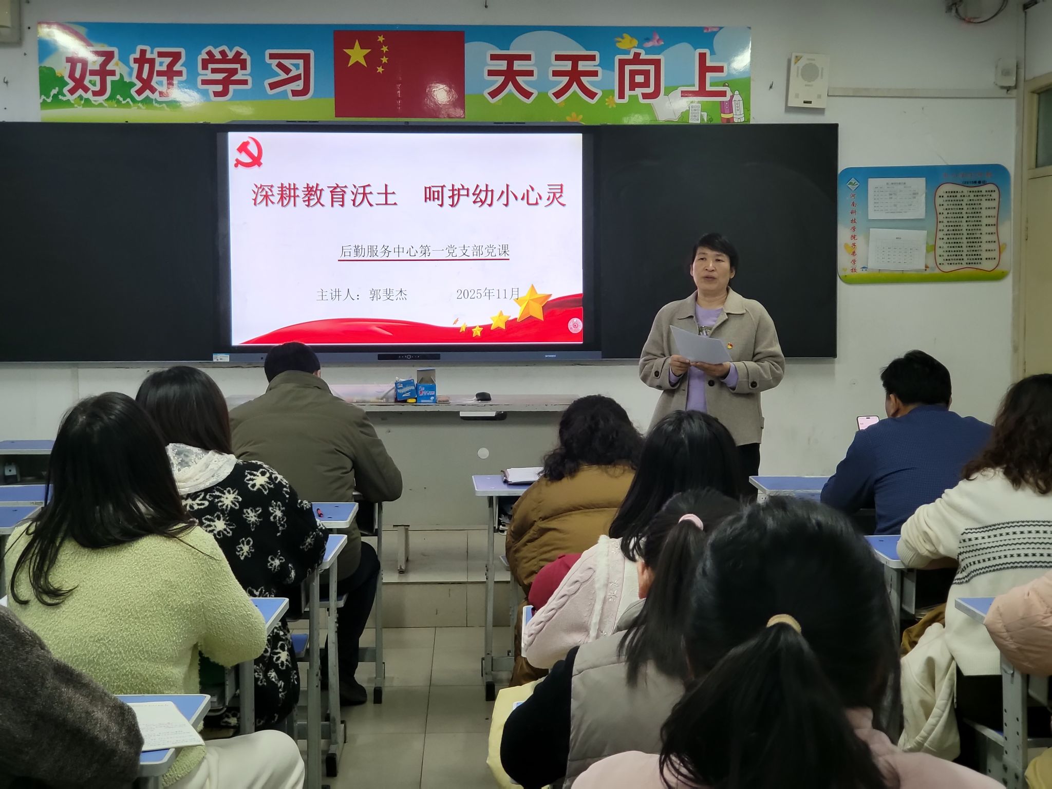 活动伊始,党支部书记郭斐杰以“深耕教育沃土 呵护幼小心灵”为主题讲授专题党课。她强调,校园安全是教育发展的基石,党员教师需牢记使命,以强烈的责任担当守护幼儿和小学生健康成长。党课结合校园安全实际,引导党员教师从政治高度认识校园安全的重要性,深刻领会“抓基层打基础是长远之计和固本之策”的内涵。