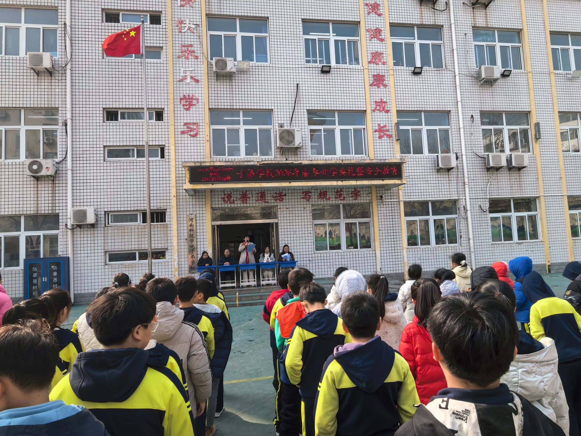 典礼在庄严隆重的升旗仪式中拉开帷幕。全体师生肃立注目、高唱国歌。