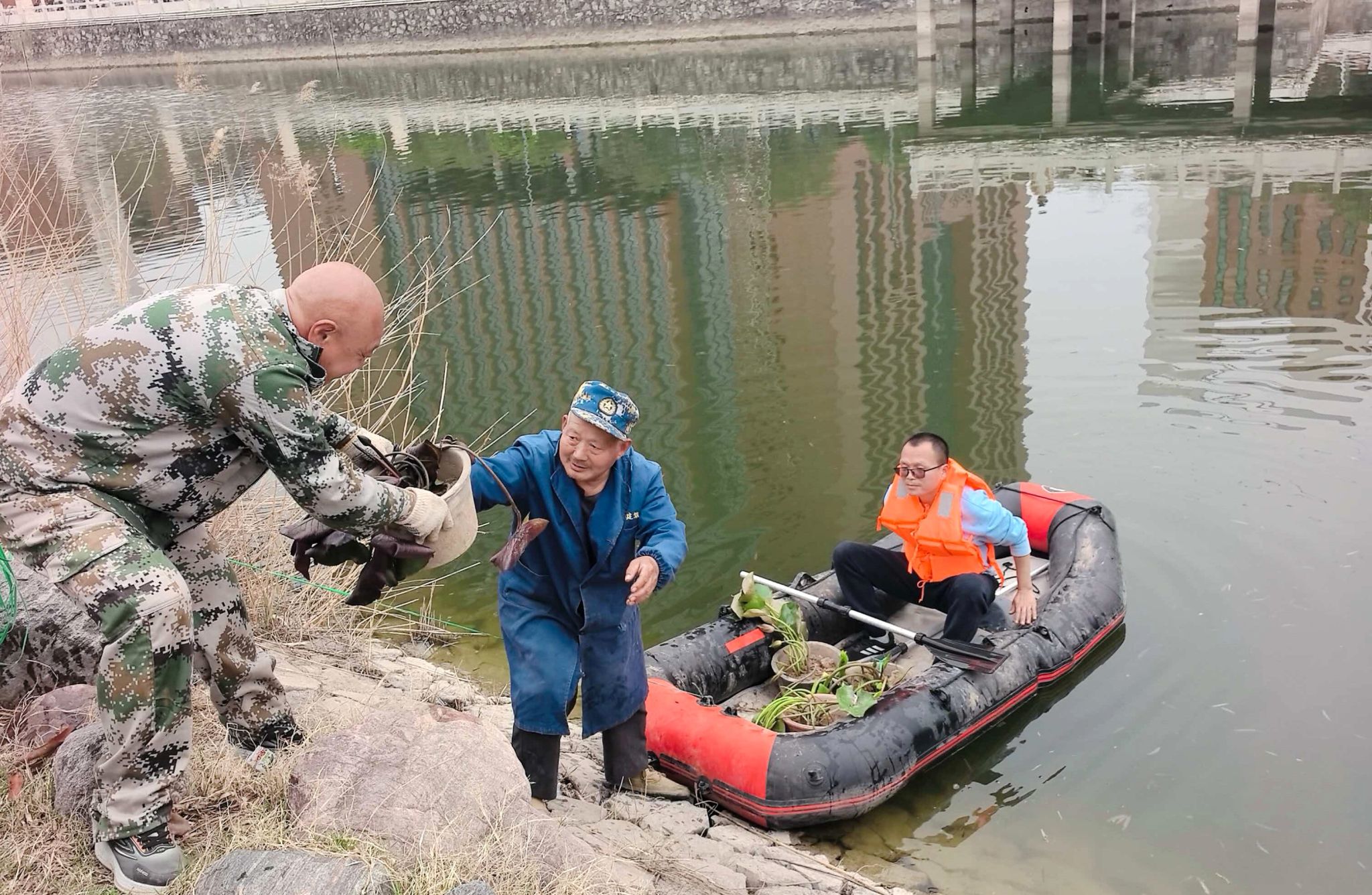 睡莲不仅具有极高观赏价值,还能有效净化水质、抑制藻类生长,是构建“水下森林”生态系统的关键植物。栽种现场,工作人员身着防水服、救生衣,分工协作、配合默契,从花盆搬运、湖面障碍物清理到精准定位投放,每一步都严谨细致。