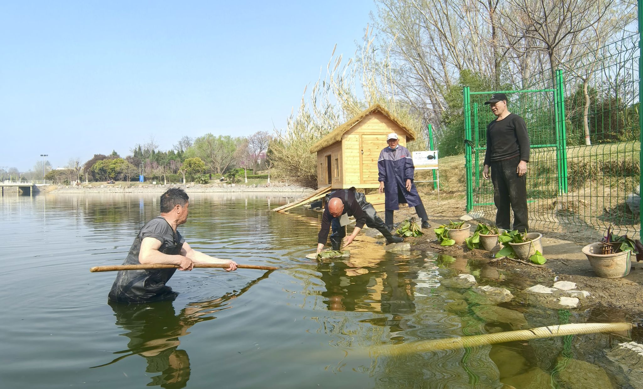 为美化校园环境、改善人工湖水质。3月27日至29日,后勤服务中心抢抓睡莲栽植黄金期,采用“皮划艇水上作业+传统人工种植”模式,顺利完成人工湖200余盆睡莲的栽种工作。