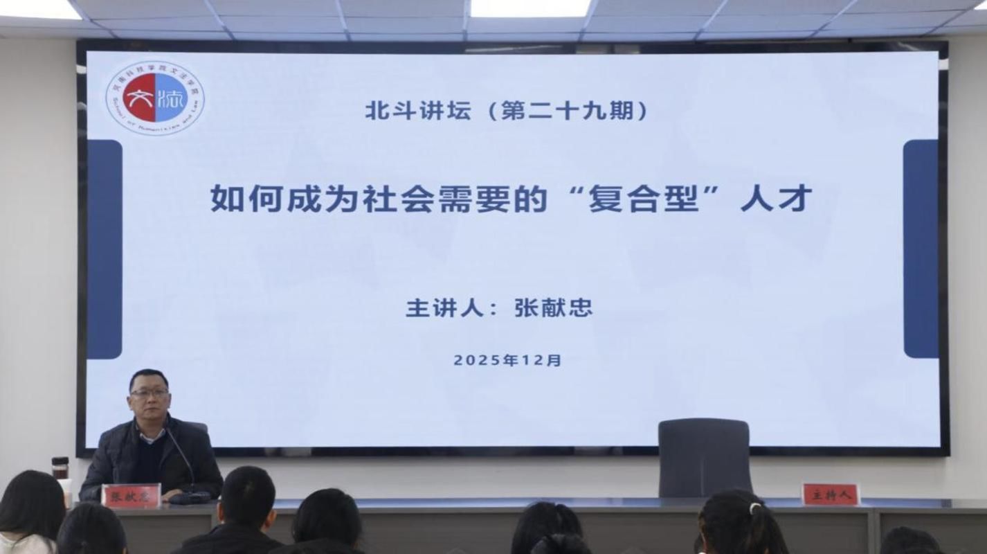 2025年12月25日下午,由校团委主办、文法学院承办的第二十九期北斗讲坛在文法学院301多功能报告厅举行。本期活动特邀河南科技学院法律行业校友会会长、客座教授张献忠为师生作题为《如何成为社会需要的“复合型”人才》的专题报告,文法学院领导班子、教师代表,全校学生代表一百余人在现场聆听了报告,会议由河南科技学院法律行业校友会副会长张艳艳主持。