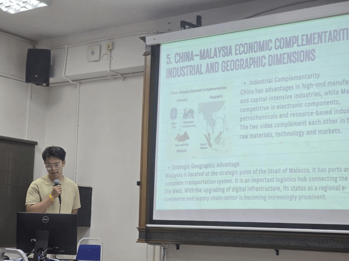 记得第一份小组作业是“马来西亚与中国的经济合作共赢”,我和两位马来同学、一位印度同学组队。最初讨论时,我习惯性地想“找标准答案”,而他们却更关注“不同视角的碰撞”。马来同学提到“马来新村政策对工业建设的影响”,印度同学从“国贸合作与全球化”切入,而我则结合国家推动的“一带一路”政策,补充了“一带一路”在经济合作中的作用。我们熬夜修改PPT,反复打磨讨论逻辑,最终报告获得了A的成绩。这也让我感悟到:学术不是“单向输出”,而是“多元观点的对话”。
