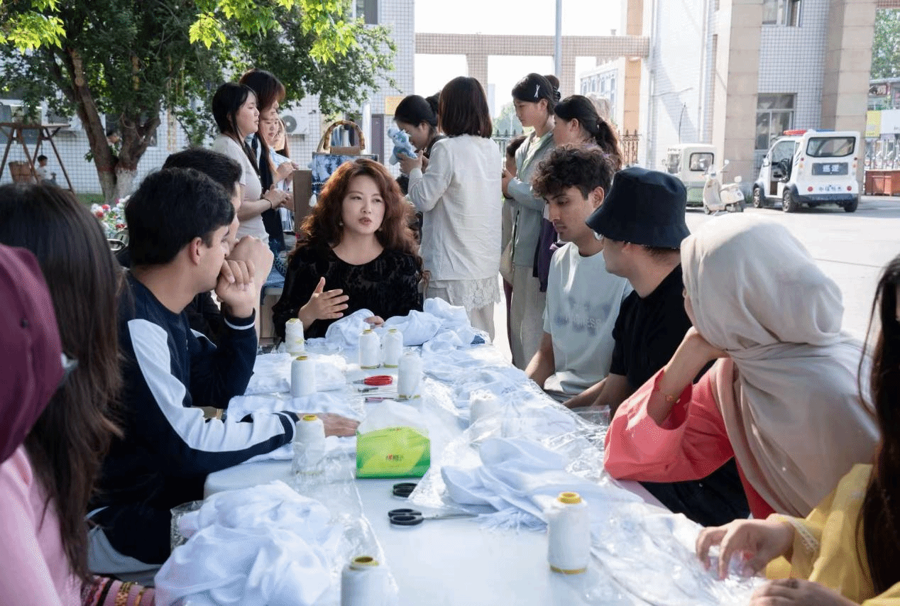 活动现场,一件件靛蓝雅致、纹样独特的蓝染作品错落陈列,涵盖围巾、手帕、帆布包等多种品类,或简约素雅,或灵动精巧,引得在场师生驻足观赏、啧啧称赞。河南医药大学、新乡学院及我校来自英国、俄罗斯、巴基斯坦、伊朗、乌兹别克斯坦、阿富汗等国的30余名中外师生应邀参与此项活动,共赴一场非遗文化之约。