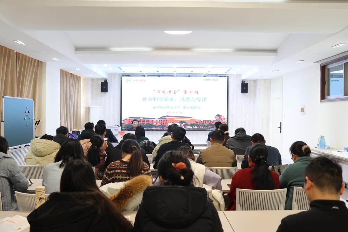 为提升思政课教师的科研能力与素养,12月4日下午,马克思主义学院开展“百农讲堂”第十期活动,邀请河南财经政法大学二级教授朱金瑞作《社会科学研究:选题与综述》专题讲座。马克思主义学院领导班子成员、全体思政课教师及2025级全日制研究生参会,讲座由学院院长王冰蔚主持。